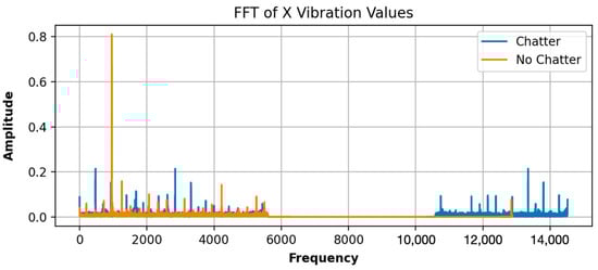 To gain a more comprehensive insight into the analysis results, visualizations of the variables that exert the most significant influence on chatter detection are provided. In the case of machine vibrations, which are the variables under evaluation for Fidia, FFT is employed to convert motion data, over time, yielding an understandable output that quantifies the extent of the recorded vibrations, as depicted in Figure 5. The amplitude signifies the intensity of the vibrations present, while the frequency indicates the number of movements in hertz (Hz).