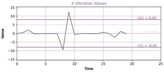 Apart from the FFT visualization (Figure 5), there is an option to represent machine vibrations on the fly, offering the potential for real-time decision support. Consequently, the vibration parameters are organized as time-series data. As illustrated in Figure 6, the mean of the displayed sample is presented, and the Upper and Lower Critical Limits (UCL, LCL) can be incorporated to define the desired quality range. It is important to note that this visualization relies on specialized technologies for handling data streams, necessitating a pre-established connection to the relevant data stream.