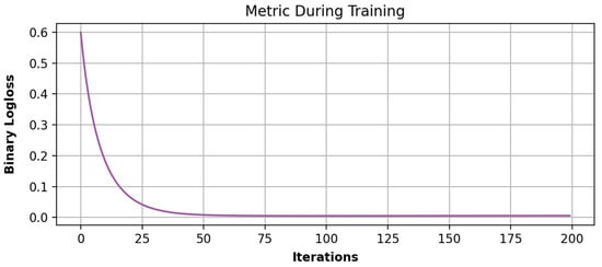 Some visualizations of the most important features of the chatter detection framework and the binary log loss values obtained during 200 training iterations are presented in Figure 7 and Figure 8, respectively.