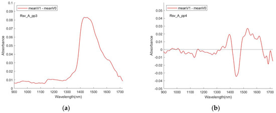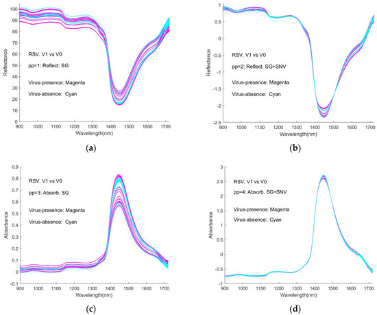 Figure 7a–f (reproduced as Appendix A, Figure A1, Figure A2, Figure A3, Figure A4, Figure A5 and Figure A6) shows the spectra of virus-presence(V1) and virus-absence(V0) RSV samples, having undergone different pre-processing (pp). Figure 7a shows the raw spectral data, as %Reflectance, smoothed with the Savitzky-Golay algorithm (pp1). The process of normalisation (SNV) results in a shifting of the spectral intensity response to positive and negative values (Figure 7b, pp2). In Figure 7c, the (SG) smoothed Reflectance values have been converted to Absorbance (pp3), while in Figure 7d, the spectra have been additionally normalised by SNV (pp4). In Figure 7e, the MSC algorithm has been applied to the smoothed (SG) Absorbance spectra (pp5), while in Figure 7f, these spectra have been further subjected to SNV (pp6) (see note in Section 2.3). It can be seen that the process of SNV significantly reduces the inter-spectral variability, as does the process of MSC. Similar results are observed for the spectral responses of the SNV-processed samples, as shown in Appendix A, Appendix B and Appendix C.