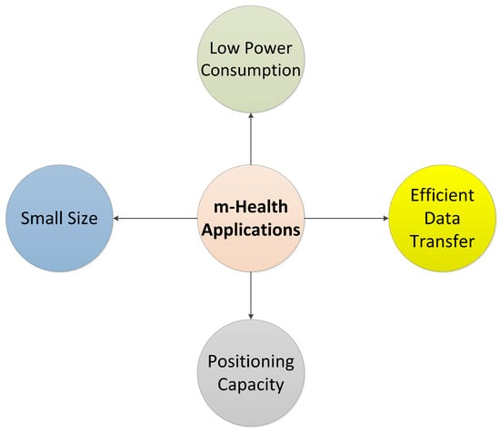 As shown in Figure 1, the essential requirements for m-Health monitoring devices are small size, low power consumption, positioning capacity, and the ability to efficiently and accurately transfer data to remote monitoring stations [].