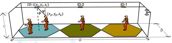 A tunnel space is considered with dimensions a m × b m × c m, similar to Figure 4; this space is divided into several hexagonal optical cells. In each of these cells, there is an LED i that transmits a cell identifier on the air and provides coverage to the region limited by that cell at a specific frequency, which can be reused in a different cell with a minimum distance from the first, thus avoiding adjacent channel interference.