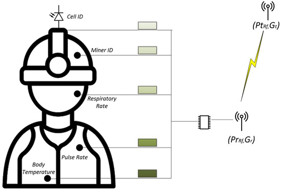 In this work, a Wireless Body Area Network (WBAN) is proposed, which is a network that operates in the miner’s body, as shown in Figure 5. In this figure, the two RF antennas represent the transmitting and receiving antennas. The notation (, ) refers to the power transmitted and the gain of the transmitting antenna. In the receiving antenna, the notation (, ) represents the minimum power received and the gain of the receiving antenna. This notation is consistent with the Friis Transmission Equation used for the link budget calculation.