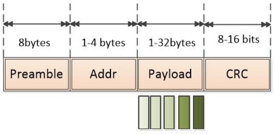To send the primary vital signs data, a single-chip radio transceiver for the 433/868/915 MHz ISM band is used. The current consumption is very low, in transmission only 11 mA at an output power of −10 dBm, and reception mode 12.5 mA. The module uses Gaussian frequency-shift keying (GFSK) modulation and Manchester encoding. The transmission mode is ShockBurst which transfers the frame as seen in Figure 6 [].