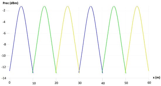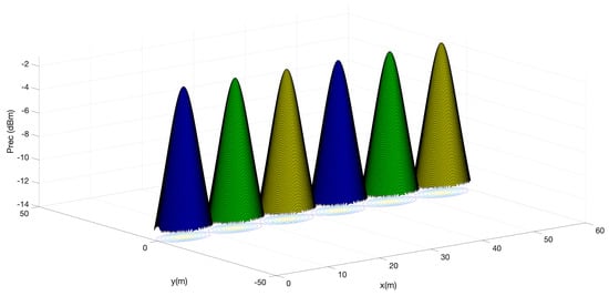 As shown in Figure 7, the performance of the proposed system in the downlink using the LEDs placed on the ceiling of the underground tunnel and the photodetector placed on the miner’s helmet is depicted to visualize the concept of proposed cells. Clearly, lobes that maximize power in the center of the cells and attenuate in the outer parts of the same can be distinguished. This result agrees with the expected behavior of the system, since the LED and photodetectors are sensitive to the presence of an object in the tunnel and their location in the scenario. This result is also in agreement with the results obtained in []. Furthermore, it is possible to observe that although the power received decreases in certain parts of the underground tunnel, it is never completely lost. Therefore, signal reception is ensured throughout the environment.