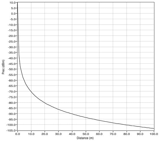 The power received for the RF uplink, as shown in Figure 9. This curve shows a gradual decrease in power received as the distance between the RF transmitter and the RF receiver increases. This behavior is in line with the expected path loss characteristics in wireless communication systems, where the received power diminishes as the distance between the transmitter and receiver increases.