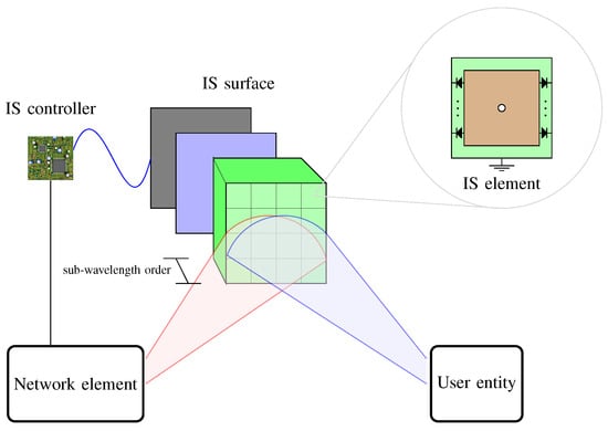 An IS is a flat structure made of specific materials, which are the base of the IS classification. Copper and graphene have been used. Researchers in wireless communications have focused on two main implementations: antenna-array-based and metasurface-based structures. The radio waves impinging on these electromagnetic material surfaces can be reconfigured to adjust the wireless propagation environment. By controlling the phase shifts and wavefront, the waves are reflected to propagate toward their desired directions. By making the wireless environment programmable and controllable, these surfaces monitor the propagation to improve the efficiency of the received signal.