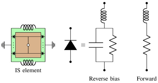 As the IS controller applies a bias voltage to the feeding lines, the IS element is energized across the via hole, and the PIN diodes change their states between “on” and “off” accordingly. The point in incorporating PIN diodes is to adjust the IS element frequency response dynamically [72]. Figure 2 shows the equivalent circuit for the IS element and both PIN diode states. For a horizontally polarized incident wave, the ground bars around the IS element central patch act as inductors horizontally [68]. With the PIN diode insertion on the IS element, its reverse bias or forward equivalent circuits can be applied to estimate the transmission coefficient and 3 dB cut-off angular frequency of the IS element.