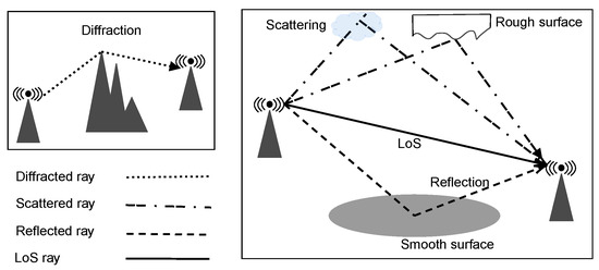 Wireless communication channels are well-known to be subjected to the multipath phenomenon [99,100]. This phenomenon occurs when the transmitted radio signal finds multiple paths between the transmitter and the receiver. However, its occurrence is connected to the propagation environment and the obstacles between the transmitter and receiver. Figure 4 shows from a pictorial perspective the main propagation phenomena.