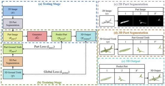 Stages 4–6 are performed only when training the point cloud generators, and 3D part segmentation is executed in advance to save training time. The following are the details of the part segmentation, point cloud generator, and loss functions in the Part2Point framework.