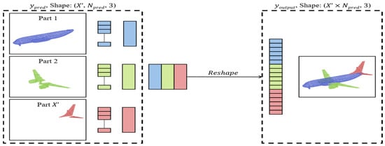 For merging part point clouds, the order of points does not need to be processed individually due to the permutation invariance property of data structure. It is sufficient to reshape the tensor size from to , where the segmented point cloud parts are sequentially arranged as a single point cloud. This operation is defined as , as shown in Figure 5.