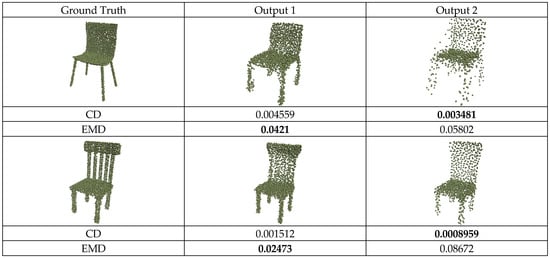 Past studies [,,] used CD as the loss function due to its computational efficiency. However, these studies found that CD could not generate high-quality point clouds with uniform distribution. This often led to the clustering or splattering of points in the reconstructed output, resulting in a visual effect that was not satisfactory.