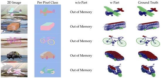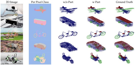 On the other hand, the datasets used in the tables and figures of experimental results are UDA-Part [] and ShapeNet Part Annotation []. We utilized the multiview 2D part segmentation dataset provided by UDA-Part and extracted corresponding 3D part segmentation point clouds from the ShapeNet part annotation as reconstruction targets for the 2D dataset. The dataset categories include cars, airplanes, bicycles, buses, and motorcycles. For the experiments, 80% of the data were used for training the used point cloud generators, while the remaining 20% served as the test set. However, the existing ShapeNet part annotation dataset only contains point cloud objects with a resolution of approximately 2000 points for representation. To test the performance of point cloud reconstruction at higher resolutions, we used the point cloud processing software, CloudCompare [], to resample 15,000 points on the mesh surface for each object from ShapeNetCore, where each point was annotated with part information. While testing the performance of reconstructing point clouds, we calculated the distance error between each part of the generated point cloud and its corresponding ground truth. Then, we summed and averaged the errors belonging to the same object part to provide the overall error of the output point cloud. As discussed in Section 3.3, we used the EMD metric for the error of point cloud reconstruction in our experimental results.
