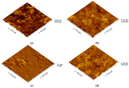 The variation of the surface roughness is related to the film thickness and the change of the sheet resistance, which can explain the highest value of ΔRsd (57.6 Ω/sq), corresponding to the larger roughness of 35.7. Regarding the dissimilar values of the sheet resistance variation for the similar values of the roughness, a possible reason can be the degree of the homogeneity of the coating across the entire surface area, the presence of agglomerates, as can be seen in Figure 2, and the connectivity and alignment of conductive particles within the coating. The agglomerate distribution, even smoother in their topography, can result in localized areas of higher or lower conductivity, leading to variations in sheet resistance from point to point across the entire area of the samples.