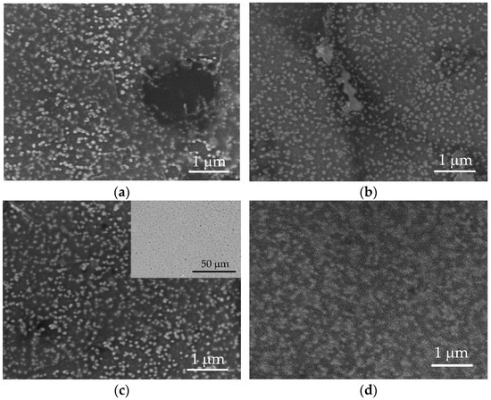 SEM images of surfaces of nanocomposite PEDOT:PSS/graphene deposited under different experimental conditions: (a) S90-3.5-10; (b) S105-3.5-10; (c) S100-2-5 (inset: in BSE mode); and (d) S100-3.5-5.