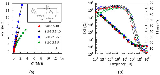 The higher values of the capacitive components of the impedance for the S90-3.5-10 layer indicate the retention of charges at both the solid/liquid interface and the internal boundaries between different polymer phases and graphene. It is known that capacitance increases with an increase in the active electrochemical surface of the electrode (the total three-dimensional contact surface with higher roughness) or the volumetric capacitance, which is proportional to the thickness of the capacitive layer [25,42]. Therefore, the results obtained for the S90-3.5-10 layer are logical given its greater thickness and roughness, as determined by the deposition conditions.