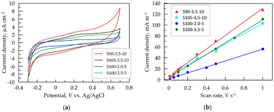 Cyclic voltammetry was employed to investigate the processes of DC charge transfer through the electrode surface and to determine the potential range where mainly capacitive charging takes place. Figure 4a presents the CV dependencies of the tested layers in artificial sweat during bidirectional potential scanning in the range from −0.3 to 0.7 V vs. Ag/AgCl. This range is experimentally determined as the capacitive potential region, dominated by capacitive behavior characterized by nearly constant positive or negative current in the anodic and cathodic direction of potential scanning, respectively. In this relatively wide potential window (up to 1 V), no faradaic reactions occur, and no current related to a typical charge transfer process flows. At more positive potentials above 0.7 V, the current shows a tendency to increase, especially for the S90-3.5-10 layer, indicating the initiation of the forced oxidative processes of the polymeric components in the composite or of organic acids in an electrolyte. The increase in cathodic current at potentials more negative than −0.2 V is most likely related to a hydrogen evolution reduction reaction catalyzed by graphene in the nanocomposite coating [46].