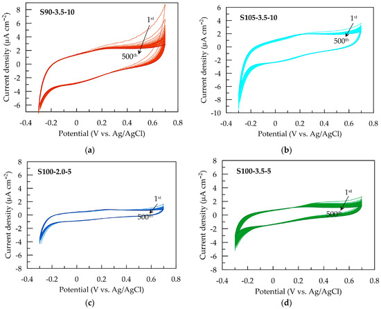 The electrochemical stability of PEDOT:PSS/graphene conductive films is assessed by potential sweeping at a rate of 0.1 V s−1 in the range from −0.3 to 0.7 V in an artificial sweat solution. Figure 5 presents CV cycles for each conductive layer. The most significant change in CV dependencies is observed for S90-3.5-10 (Figure 5a) during the first ten scans in the anodic region at potentials above the open-circuit equilibrium value. The reduction in the area of the anodic peak suggests a decrease in anodic activity after partial oxidation in the initial cycles. Slight changes are observed for S105-3.5-10 and S100-2-5 over 500 cycles.