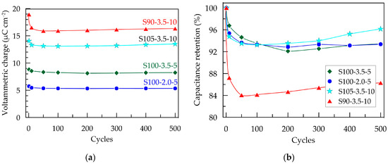 The change in capacitance and capacitance retention over 500 CV cycles is presented in Figure 6. As mentioned earlier, the S90-3.5-10 sample exhibits the most significant decrease in QCV after the first cycle. This could be attributed to more pronounced structural changes occurring during the initial electrochemical loading of the layer. These changes are likely associated with the penetration and saturation of the polymer layer with ions from the electrolyte [28]. It can be expected that this effect becomes more pronounced with an increase in the thickness of the layers, where the contraction/expansion of the polymer caused by the release/incorporation of ions from the electrolyte occurring under cyclic electrical loading is more significant [32]. As a result of the changes in the composite layer, the capacitance of the thickest layer, S90-3.5-10, decreases by 16% after the first 50 cycles. However, no further reduction is observed in the subsequent cycles; on the contrary, the capacitance shows a tendency toward weak recovery. The other three samples with smaller thicknesses demonstrate excellent electrochemical stability, with a reduction in QCV below 6% (Figure 6b).