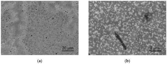 SEM images in BSE mode of the S100-2.0-5 surface after 500 CV cycles at: (a) 1000× and (b) 20,000× magnification.