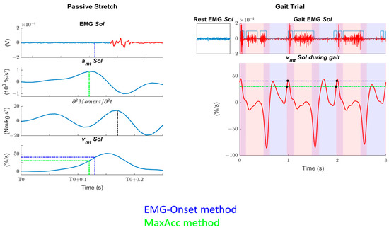 Statistical differences in the Tvmt values between the EMG-Onset and MaxAcc methods were only encountered for Sem and Rf. Nevertheless, once applied to gait, these Tvmt value differences did not lead to any statistical difference regarding the proportion of the gait trial time with vmt > Tvmt, or on the number of times where Tvmt was exceeded. This low number of statistical differences confirms that the MaxAcc method provides results close to the EMG-based ones. We would also like to highlight the fact that we found Tvmt values consistent with the study in [14] that tested Gas and Sem (median (IQR) values (%/s): Gas: 28.5 (9.8); Sem: 30.5 (15.5)). In addition, these authors also found that for about half of the children tested, the Gas muscle lengthening velocity during gait did not exceed its Tvmt, while it was always exceeded for Sem. Concerning Gas, this finding could suggest that the abnormalities observed during gait could be more a consequence of non-neural hyper-resistance, i.e., higher passive stiffness, as suggested by other articles [41]. Thus, we believe that the proposed method based on maximal musculotendon acceleration could be a substitute for EMG-based ones. Even if, a priori, EMG-Onset methods are more physiologically relevant, they may lack reliability because the signals can be noisy and because it is difficult to precisely detect their abrupt change. Moreover, EMG-Onset detection algorithms depend on hyperparameters, which could be challenging to optimize for a large number of subjects. Indeed, the EMG-Onset methods have sometimes led to physiological inconsistencies. Taking the vmt values 30 ms before EMG-Onset as Tvmt, to take into account the stretch reflex delay admitted in the literature [35,36], led to some cases where the Tvmt values were determined at timings before the beginning of the stretch (pre-T0) or after the occurrence of the catch (post-catch). This was never encountered with the MaxAcc method. This method is based on a simple detection of a peak on kinematic curves. To obtain these curves, an instrumented assessment of the muscle stretches is required, with skin markers (or other sensors) allowing for musculoskeletal modeling. Nevertheless, as the objective is to compare Tvmt and vmt during gait, gait analysis can be performed before muscle stretches, as in the present protocol, and the subjects are, therefore, already equipped with skin markers and sEMG electrodes.