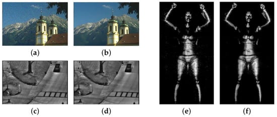 - Dai, L.; Zhang, Y.; Li, Y.; Wang, H. MMW and THz images denoising based on adaptive CBM3D. In Proceedings of the Sixth International Conference on Digital Image Processing, Athens, Greece, 5–6 April 2014; Volume 9159, pp. 23–28. [Google Scholar]