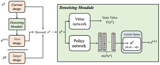 The overall architecture of the proposed method. At the t-th step, given the image , the agents execute the action to generate the next image, , according to the strategy is generated by the policy network; it then uses the current image , the next image , and the target image to calculate the similarity reward, which is used to train the denoising module to help optimize the strategy of the next step.