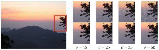 An example image of different noise levels (15, 25, 35, and 50) and the denoising results of our method under the corresponding noise levels. The top line represents the area of the noisy image, and the bottom line represents the result after denoising.