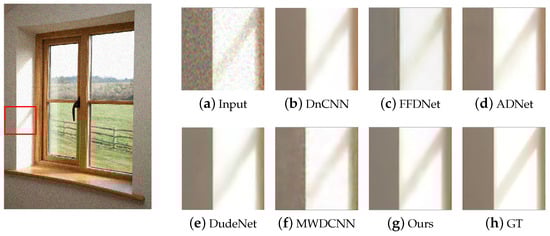 In this section, we demonstrate the denoising effect of RGB images after adding AWGN. In order to compare the performance of our proposed method, we compared it with several SOTA methods: DnCNN [], FFDNet [], ADNet [], DudeNet [], and MWDCNN []. We retrained the methods mentioned above according to the setting and conducted a series of comprehensive experiments, including visual quality comparison and image quality evaluation, to qualitatively and quantitatively analyze the denoising performance of the proposed model.