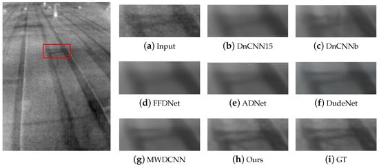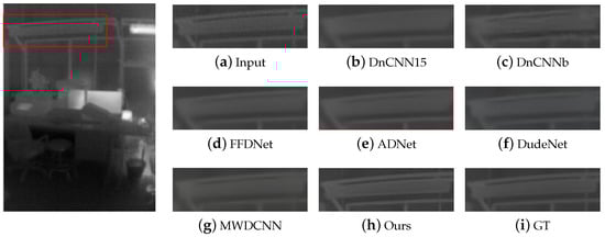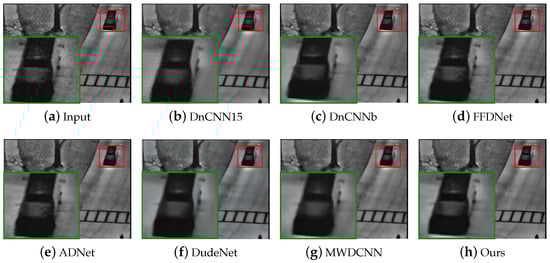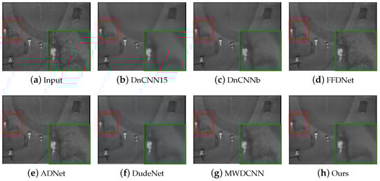 We conducted qualitative and quantitative comparisons on two public infrared datasets: the paired infrared denoising database (http://openai.raytrontek.com/, accessed on 8 April 2022) and the pedestrian dataset (the OSU thermal pedestrian database) []. The former is a real-world infrared image-denoising database proposed by the Robotics and Artificial Intelligence Laboratory of IRay Technology Co., Ltd. (Yantai, China). It contains 2000 low-quality and high-quality infrared image pairs in different scenarios, and the content is mainly indoor scenes. Since there are many images with repeated scenes in the paired infrared denoising dataset, we selected 100 typical images to form a test dataset called “Pair100”. The OSU thermal pedestrian database contains 284 noisy infrared images in 10 subsets, with common outdoor scenes, pedestrians, and vehicles as the main content. We compared this with DnCNNb [] (DnCNNb is the model trained by blind denoising), FFDNet [], ADNet [], DudeNet [], MWDCNN [], HI-GAN [], and LG-BPN []. Moreover, we additionally conducted experiments using DnCNN15, DnCNN25, and DnCNN50 (DnCNN15 is the model trained with a noise level of 15, and the same applies later).