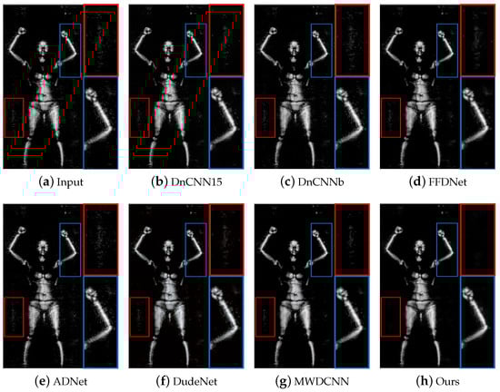 Figure 9 and Figure 10 show the visual experimental results of some experiments. For the obvious noise blocks in the terahertz image (e.g., the part inside the red box in Figure 9), the comparison methods have a poor removal effect and retain some noise, but our method can effectively remove them. Moreover, for spot-like noise around the human body (e.g., the part inside the box in Figure 10), our method also achieves better removal results than other methods.