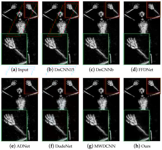 It can be observed that DnCNN is prone to excessive denoising, resulting in the loss of some details, and DnCNN15 produces more blur artifacts compared to DnCNNb; FFDNet and ADNet handle some noise poorly and retain more noise; DudeNet has more blur, while MWDCNN produces some distortions and artifacts. Compared with the above methods, our method avoids excessive blurring and artifacts and retains details as much as possible while removing noise.