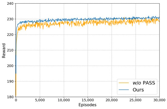 It can be seen that after adding the “PASS” action, the PSNR and SSIM under four noise levels have been significantly improved. Figure 11 shows the training curves of the method during ablation experiments, demonstrating the convergence of the algorithm training process. From Figure 11, we can see that the cumulative reward value obtained by all pixels after six steps of each episode rises dramatically and stabilizes eventually with the increase in episodes. Moreover, the reward will remain at a relatively higher value and be more stable after adding the “PASS” action, which also proves the necessity of the “PASS” action.