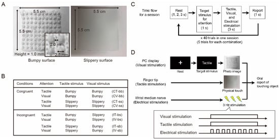 Experimental design. (A) Characteristics of two materials with different degrees of surface smoothness (i.e., bumpy and slippery) used in the experiment. For tactile stimuli, one of the physical materials was presented to the right index finger, and for visual stimuli, one of the photo images of the materials was presented on a PC display. (B) A table summarizing eight combinations of attention, tactile, and visual stimuli in the two experimental conditions, congruent and incongruent. (C) Time flow for a session. One trial consisted of four periods that lasted 6–8 s in total depending on the lengths of the rest period. In the second period, one of the two target stimuli, tactile or visual, was shown on the screen for 1 s so that the participants would pay attention to the instructed stimulus in the next period. In the third period of 3 s, a photo image of the two materials was presented on the screen, and one of the physical materials was presented to the corresponding participant’s index finger. Electrical stimulation was also applied to the right wrist median nerve throughout the period. In the fourth period, the participants verbally reported which material they were touching within 1 s. One session included 40 trials consisting of 5 trials for eight individual combinations in random order. One participant engaged in three sessions in total. (D) An example trial of stimulus presentation. This example shows an incongruent condition in which the bumpy surface is presented as a visual stimulus and the slippery surface is presented as a tactile stimulus during tactile attention. When visual and tactile stimuli were presented, electrical stimulation was also presented to evoke SEP. During the stimulus presentation time, visual and tactile stimulation were presented continuously but electrical stimulation was presented discretely.
