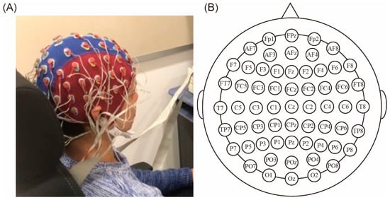 EEG settings. (A) The EEG setup. (B) Electrode placement based on the international 10–20 method.