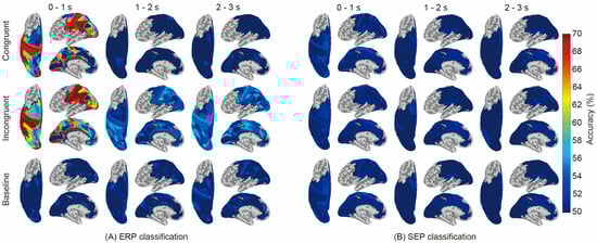 Figure 3 compares the classification results regarding ERP (A) and SEP (B). ERP showed significantly higher accuracy than the baseline (i.e., the chance level calculated using shuffled labels) in some regions and time periods, whereas SEP showed no significant difference from the baseline in all areas and conditions. The names of the brain areas and classification accuracies are shown in Tables S1 (congruent vs. baseline, 0–1 s), S2 (congruent vs. baseline, 1–2 s), S3 (congruent vs. baseline, 2–3 s), S4 (incongruent vs. baseline, 0–1 s), S5 (incongruent vs. baseline, 1–2 s), S6 (incongruent vs. baseline, 2–3 s), S7 (congruent vs. incongruent, 0–1 s), S8 (congruent vs. incongruent, 1–2 s), and S9 (congruent vs. incongruent, 2–3 s) in the Supplementary Materials.