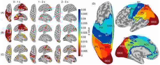 In Figure 4A,B, the brain regions showing significantly higher accuracies compared to the baseline are colored according to the p-values. The results indicated that the congruent condition (A) used wider-temporal-stage signals for classification; furthermore, the incongruent condition (B) required wider brain regions, including the SMA and the dorsal part of the PM, and wider temporal stages, including 1–2 and 2–3 s.