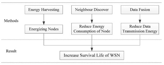 As presented above, the energy harvesting technology and energy saving mechanisms (including low-duty cycle and data fusion) are the two main means to extend the service life of wireless sensor networks. However, in previous studies, they often focused on only one technology and did not comprehensively consider the problem of extended service life span of wireless sensor networks. Based on this case, we comprehensively used technologies such as energy harvesting, neighbor discovery and data fusion to analyze the energy supply and energy consumption of nodes, and hoped to propose a new approach to achieve a reliable and efficient way to secure energy in WSNs.