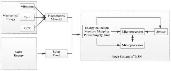 Energy harvesting technology can convert the ubiquitous energy such as thermal energy, solar energy, wind energy, and electromagnetic energy into electrical energy through the appropriate power electronic equipment and the voltage conversion circuit. At present, there are many more developed energy harvesting technologies, and the main source of their energy is generally mechanical vibration energy, electromagnetic radiation energy, solar energy, heat energy, and other energy. In order to realize the self-power supply demand of each sensor node in a WSN, we use solar energy and mechanical energy as the energy source of energy harvesting technology to realize the conversion to electric energy. The framework diagram of node energy supply in a WSN is shown in Figure 2. In this system, the organic combination of piezoelectric power generation technology and solar power generation technology is used to create a complementary effect and fully guarantee the energy supply of the energy harvesting module to the sensor nodes.