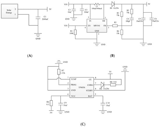 The power supply circuit is mainly divided into three parts. The first is the solar power generation circuit, as shown in Figure 3A. The solar panel can output about 5 V DC voltage, and the large capacitance is used to maintain the stability of the voltage. The second is the piezoelectric ceramic power generation circuit, as shown in Figure 3B. We use the MP1541 chip to design voltage boost conversion circuit with a fixed frequency and peak current mode. The third is the electric energy storage circuit, as shown in Figure 3C. We use the TP4056 chip to design the charging circuit completing the power supply to the lithium battery.