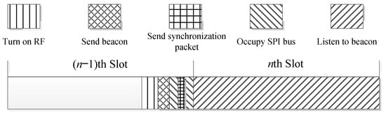 The sending and receiving separation beacon mechanism based on reply ACK is as shown in Figure 4, where nth slot represents the nth time slot, and it is active. At this point, the node will turn on the RF at the end of the (n − 1)th slot and transfer the RF from the launch completion state to the send beacon state. Then, the beacon is sent before the end of the (n − 1)th slot and the RF is converted to the listening beacon state, and the node will only listen to the beacon in the active time slot. When node A meets node B in an active time slot, node A receives the beacon sent by node B, and it immediately enters the stage of replying to ACK after analysis and verification processing. The bidirectional discovery between nodes can be completed after node B successfully receives ACK.