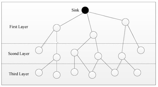 As shown in Figure 5, the white nodes are the ordinary nodes in the network, and they can be layered by the message flooding of Sink nodes. In this process, the Sink node broadcasts a request message to all adjacent nodes, and these nodes that have received the message need to set their layer value to 1 and continue to broadcast the message to the surrounding nodes. After receiving the message, the surrounding nodes should first check whether their layer value has been set. If not, their own layer value adds 1 on the basis of the broadcast layer value; that is, their layer value is 2. These nodes with level 2 continue to broadcast this message; thus, the third layer node will be formed, and then all nodes will finally have their own layer value.