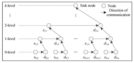 The operation process of spatial–dimensional data fusion using integer wavelet transform is as follows. Step 1: Integer wavelet transformation of data for the underlying node. The nodes underlying the network are divided into the even nodes s0,i and the odd nodes d0,i in the order, and then the even node s0,1 transmits its data to the adjacent odd node d0,1 and calculates the integer wavelet coefficients s1,1 and d1,1. Correspondingly, all the coefficients of the one-level wavelet decomposition (d1,1, d1,2, …, d1,n) and (s1,1, s1,2, …, s1,n) can be obtained. Step 2: Integer wavelet transform of data for the convergence node. The underlying odd nodes send the low-frequency coefficient (s1,1, s1,2, …, s1,n) to the convergence nodes of the upper layer and form a new data sequences. By repeating the Step 1 operation, we can obtain the three-level wavelet transform coefficients (d2,1, d2,2, …, d2,n) and (s2,1, s2,2, …, s2,n). Step 3: Integer wavelet transform of data for the Sink node. The Sink node obtains the k-level wavelet transform coefficients (dk,1, dk,2, …, dk,n) and (sk,1, sk,2, …, sk,n). The diagram of spatial–dimensional data fusion of nodes is shown in Figure 6.