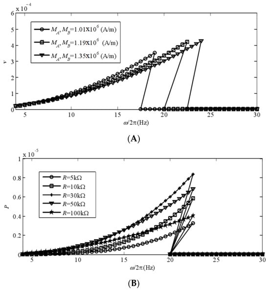 The power generation performance of a bistable piezoelectric cantilever oscillator: (A) amplitude–frequency curves at different magnetization strengths; (B) output power at different impedance levels.