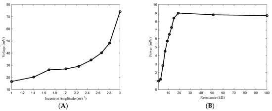 The power generation performance of a bistable piezoelectric cantilever oscillator: (A) average voltage curves for different excitation intensities; (B) average power curves at the different impedances.