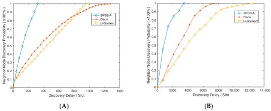 In this experiment, the sending and receiving separation beacon mechanism based on reply to ACK (SRSB-A) is tested on the operating system Tiny OS 2.0 and the sensor node Telos B. To evaluate the performance of SRSB-A, we compare it with protocols such as Disco, U-Connect, etc. Figure 9A shows the contrast experiment with a 5% duty cycle in asynchronous symmetric scenes. The results show that the node in the SRSB-A can be successfully found by its neighbor node within 320 time slots, and in the worst discovery delay, the SRSB-A was reduced by 66.67% and 75% over Disco and U-connect, respectively. As shown in Figure 9B, in the contrast experiment with a 5% duty cycle in asynchronous asymmetric scenes, the node in the SRSB-A can successfully discover neighbor nodes within 3600 time slots. In the worst discovery delay, the SRSB-A was reduced by 53.37% and 71.27% over Disco and U-connect, respectively. Based on the above analysis, it can be considered that the SRSB-A has a good performance.