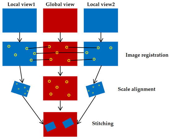 Then, the global camera image is enlarged by times using the bilinear interpolation algorithm. The enlargement ratio corresponding to different local camera images is denoted as , and calculated as follows:
