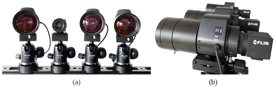 Inspired by the above biomimetic principles, this paper proposes and designs a scalable multi-scale unstructured array camera imaging method. The unstructured array camera is designed with one wide-angle camera and three long-focal length cameras. Among them, the wide-angle camera uses a 16 mm fixed-focus lens to capture large field of view images similar to the human eye, which this paper refers to as the “global camera”. A lens with a variable focal length of 25–135 mm is used to capture high-definition images of local areas, which this paper refers to as the “local camera”. All cameras are FLIR BFSU3-120S4C-CS rolling shutter cameras, equipped with Sony IMX226 sensors, capable of capturing 4000 × 3000 resolution, 10-bit color depth images at a frequency of 30 frames per second. All cameras are mounted on a gimbal fixed on a 50 cm long rail, and each camera can freely change its viewing angle, and the three local cameras can freely adjust the lens focal length. The unstructured array camera is shown in Figure 3.