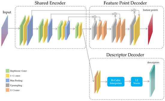 The data flow of this neural network model is as follows: given an input image, first scale its size to , then input the processed image into the shared encoder. The shared encoder is a deep separable convolution network used to obtain the deep features of the image. The deep features of the image outputted by the shared encoder are used as inputs for both the feature point decoder and the descriptor decoder. In the feature point decoder, the position information lost in the shared encoder is restored through up-sampling operations to get the feature point probability map of the image; in the descriptor decoder, convolutional filtering and differential amplification are used to obtain the corresponding feature point descriptors of the image. The obtained feature point probability map and feature point descriptors will be used for subsequent image location and scale ratio calculations.