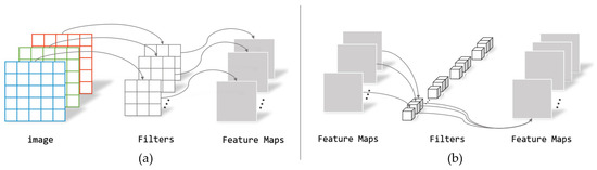 Existing deep learning-based feature point extraction methods mostly use VGG-like network models to extract features from input images. The VGG network model is a high-performance image feature extractor, but it has many network parameters and a large amount of computation, resulting in low efficiency in image feature point matching tasks in real-time high-resolution scenarios. To reduce the number of network model parameters and the amount of computation, and to speed up the model’s feature point extraction, this paper proposes the use of lightweight deep separable convolution [33] as a replacement for the VGG-like network model. Deep separable convolution divides traditional convolution into intra-channel and inter-channel convolutions, as shown in Figure 6. Suppose the size of the input image is . Intra-channel convolution performs convolution operations separately on each channel using kernels of size , extracting feature vectors within each channel, and obtaining a total of feature maps. Inter-channel convolution uses kernels of size to carry out traditional convolution operations on feature maps, to extract features between different channels.
